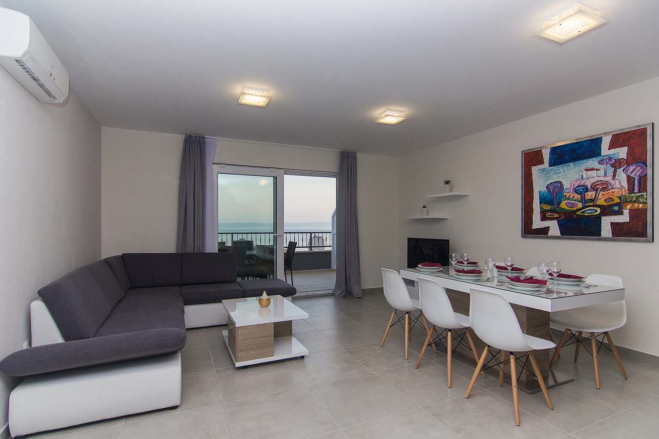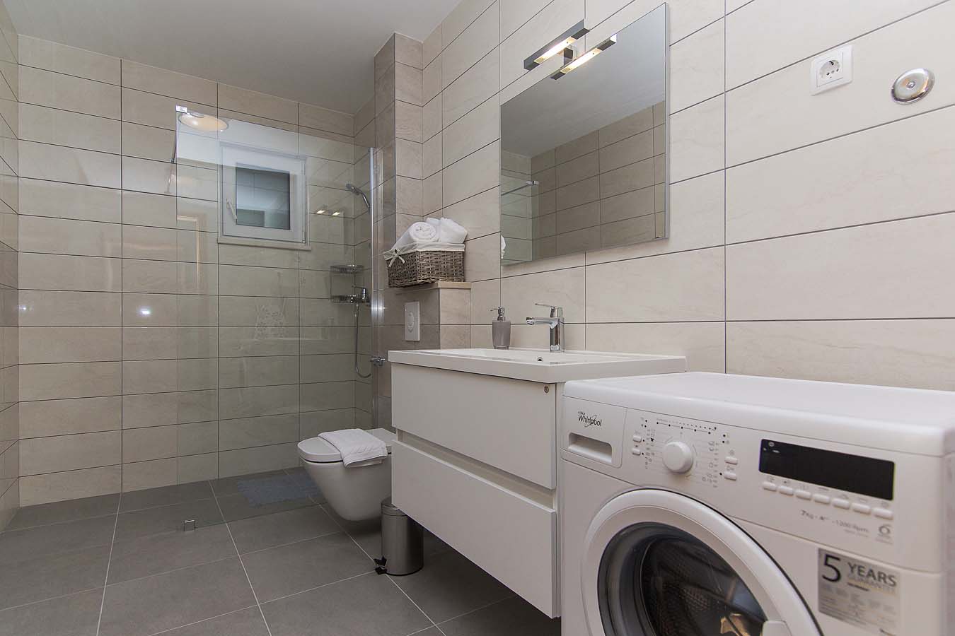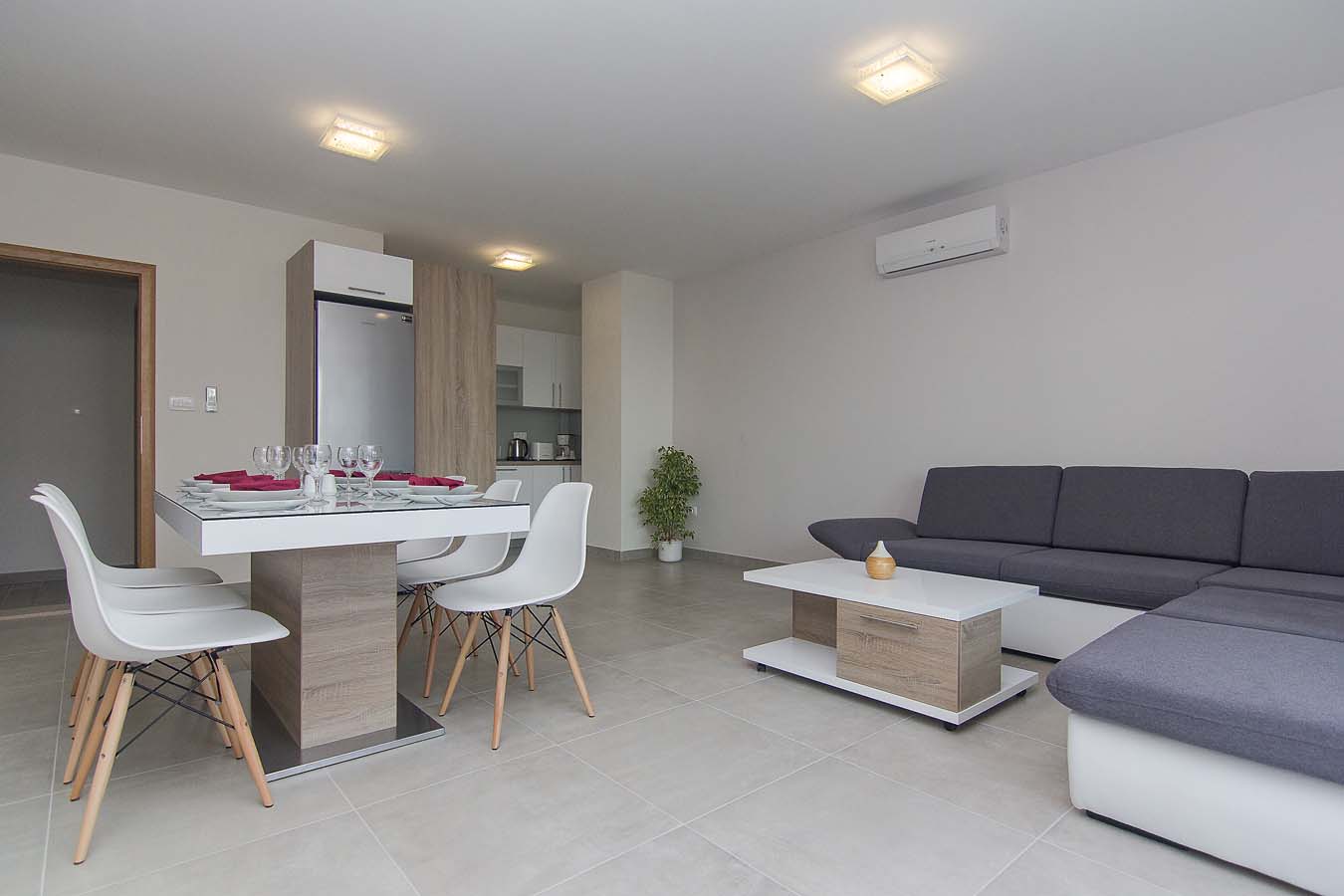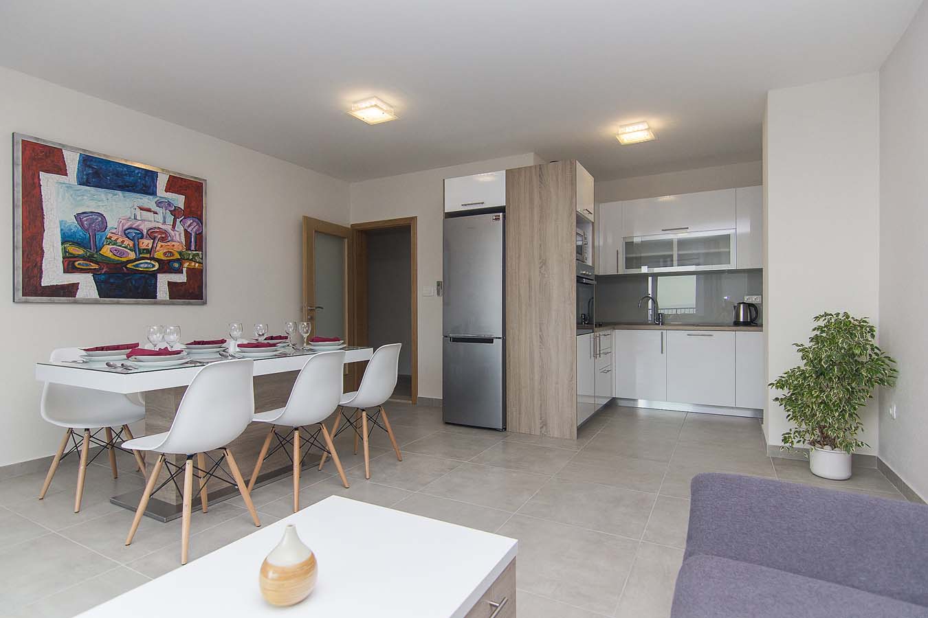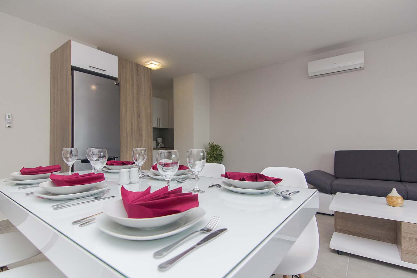 Kuhinja je opremljena sa pećnicom, perilicom posuđa, hladnjakom sa zamrzivačem, mikrovalnom pećnicom i svim potrebnim posuđem. Nadalje, uz kuhinju se nalazi blagovaonica sa velikim stolom za 8 osoba i balkonom. Stan je opremljen klima uređajem, SAT TV-om i WiFi internetom, a sve sobe imaju klimu. U blizini bazena je i zajednički roštilj. Privatni parking za do 10 automobila nalazi se u garaži u prizemlju kuće i povezan je dizalom sa ostatkom ville.