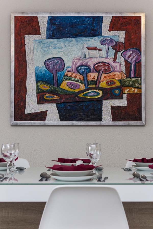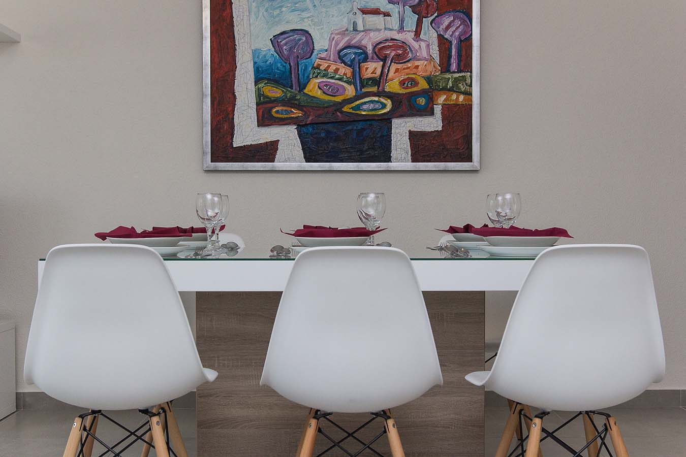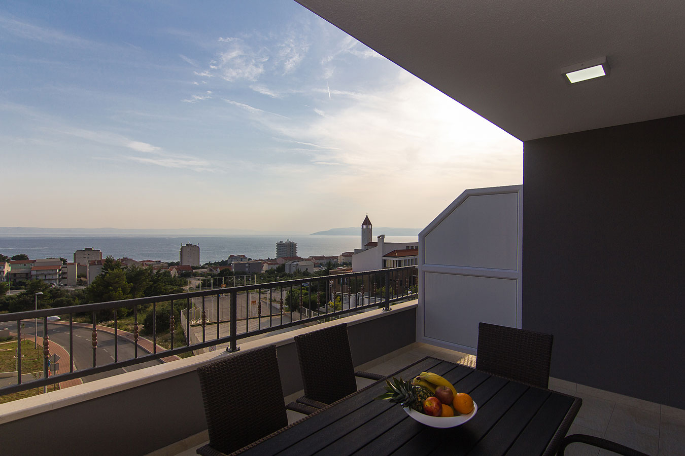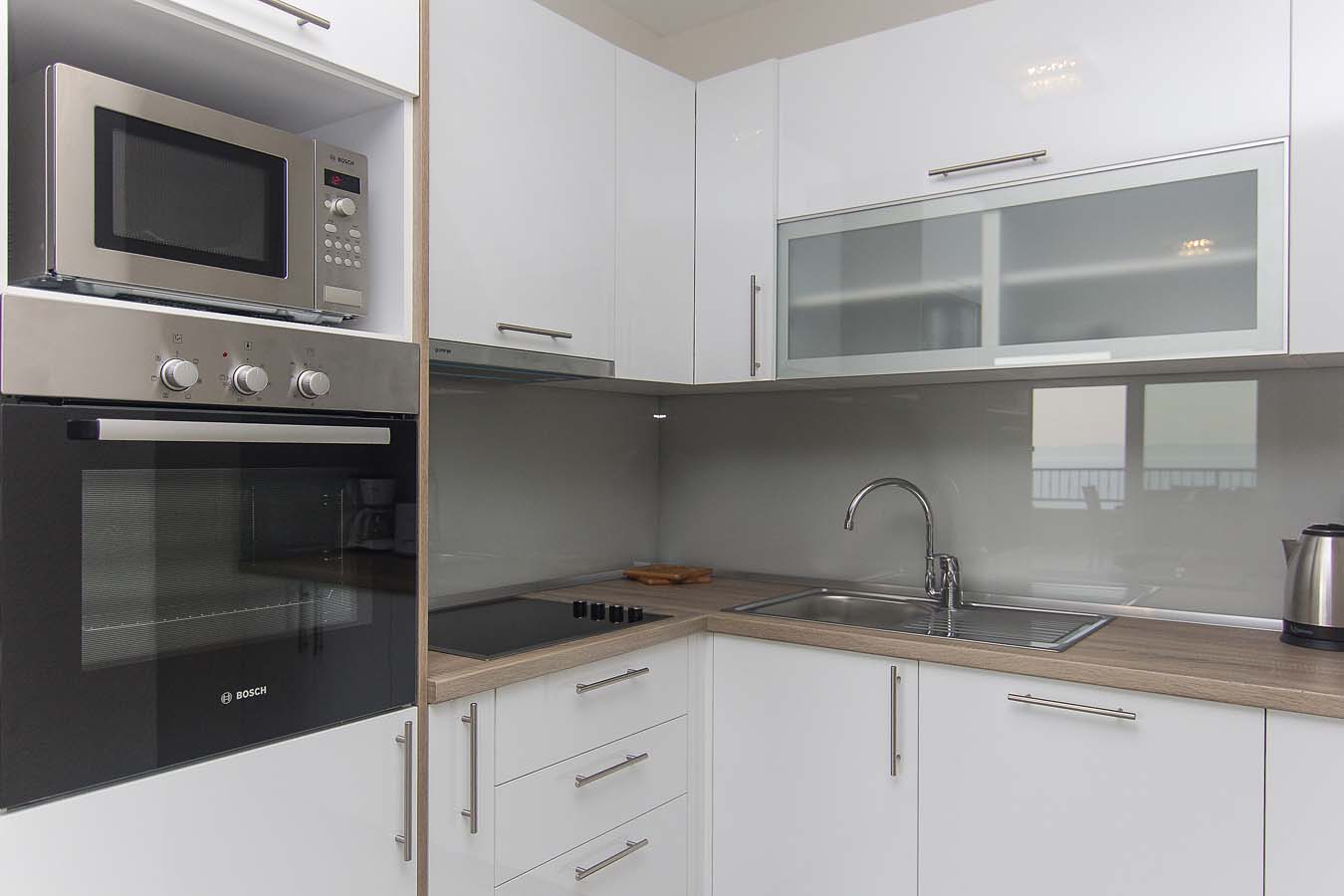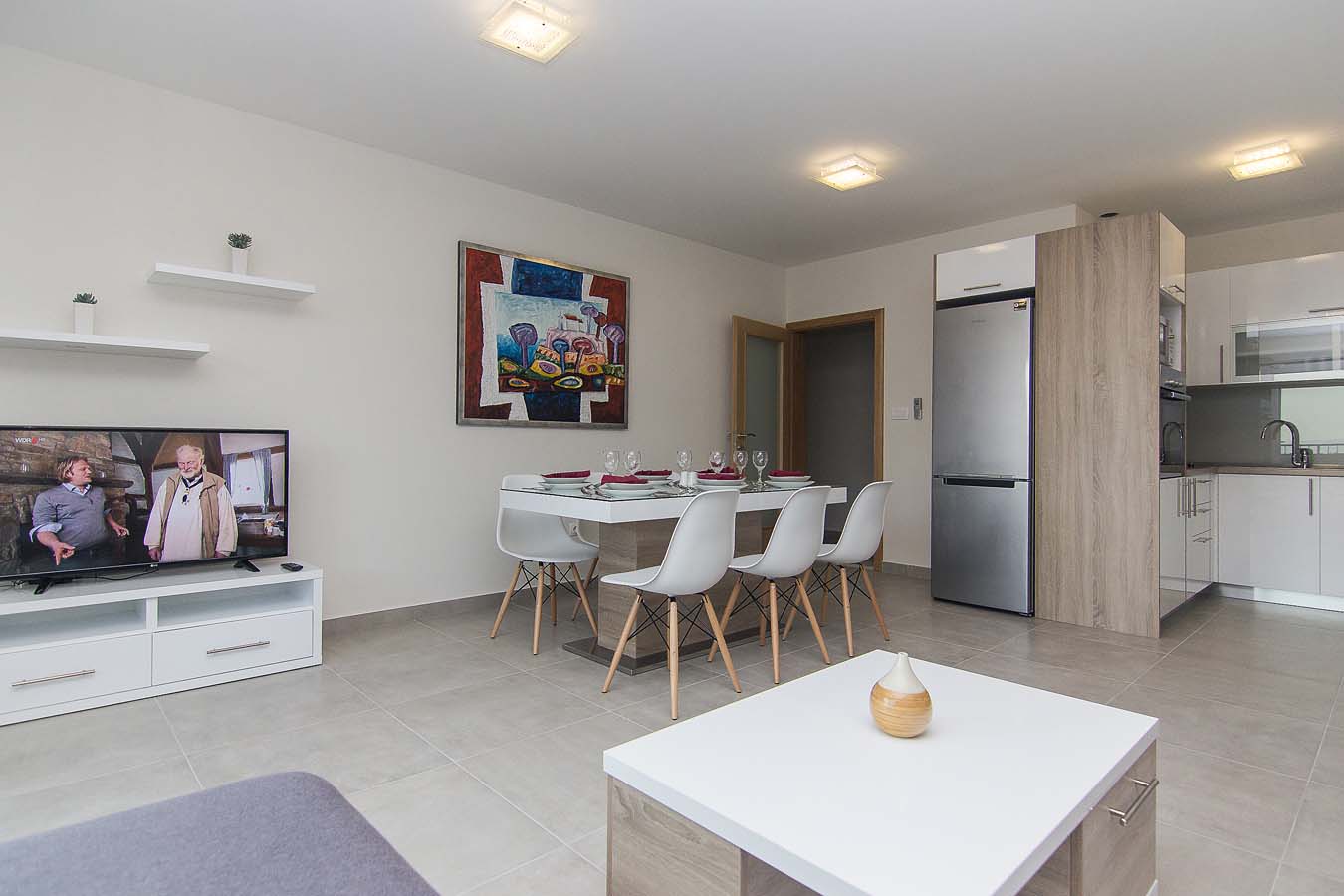 Kuhinja je opremljena sa pećnicom, perilicom posuđa, hladnjakom sa zamrzivačem, mikrovalnom pećnicom i svim potrebnim posuđem. Nadalje, uz kuhinju se nalazi blagovaonica sa velikim stolom za 8 osoba i balkonom. Stan je opremljen klima uređajem, SAT TV-om i WiFi internetom, a sve sobe imaju klimu. U blizini bazena je i zajednički roštilj. Privatni parking za do 10 automobila nalazi se u garaži u prizemlju kuće i povezan je dizalom sa ostatkom ville.