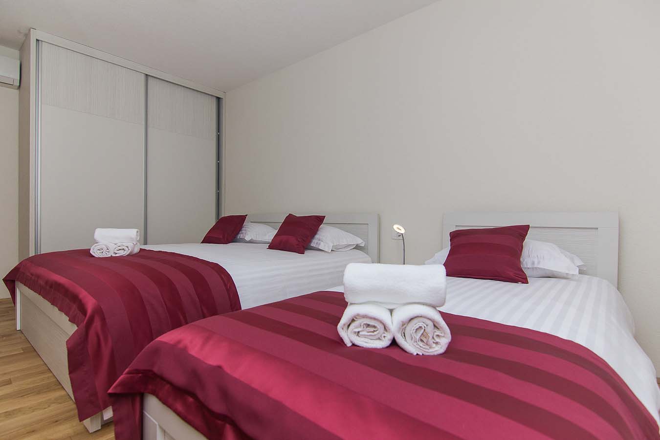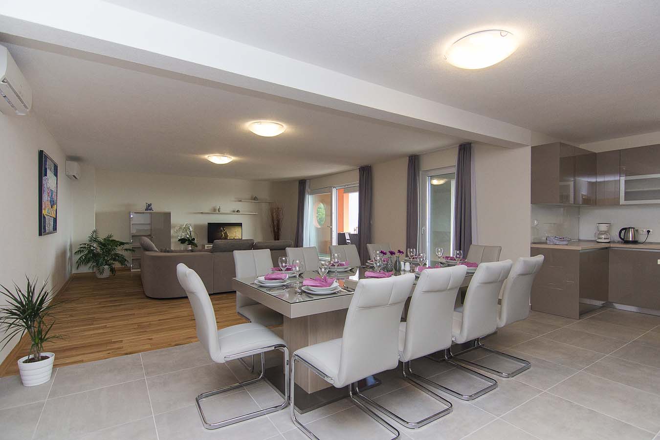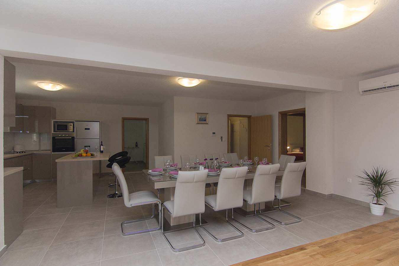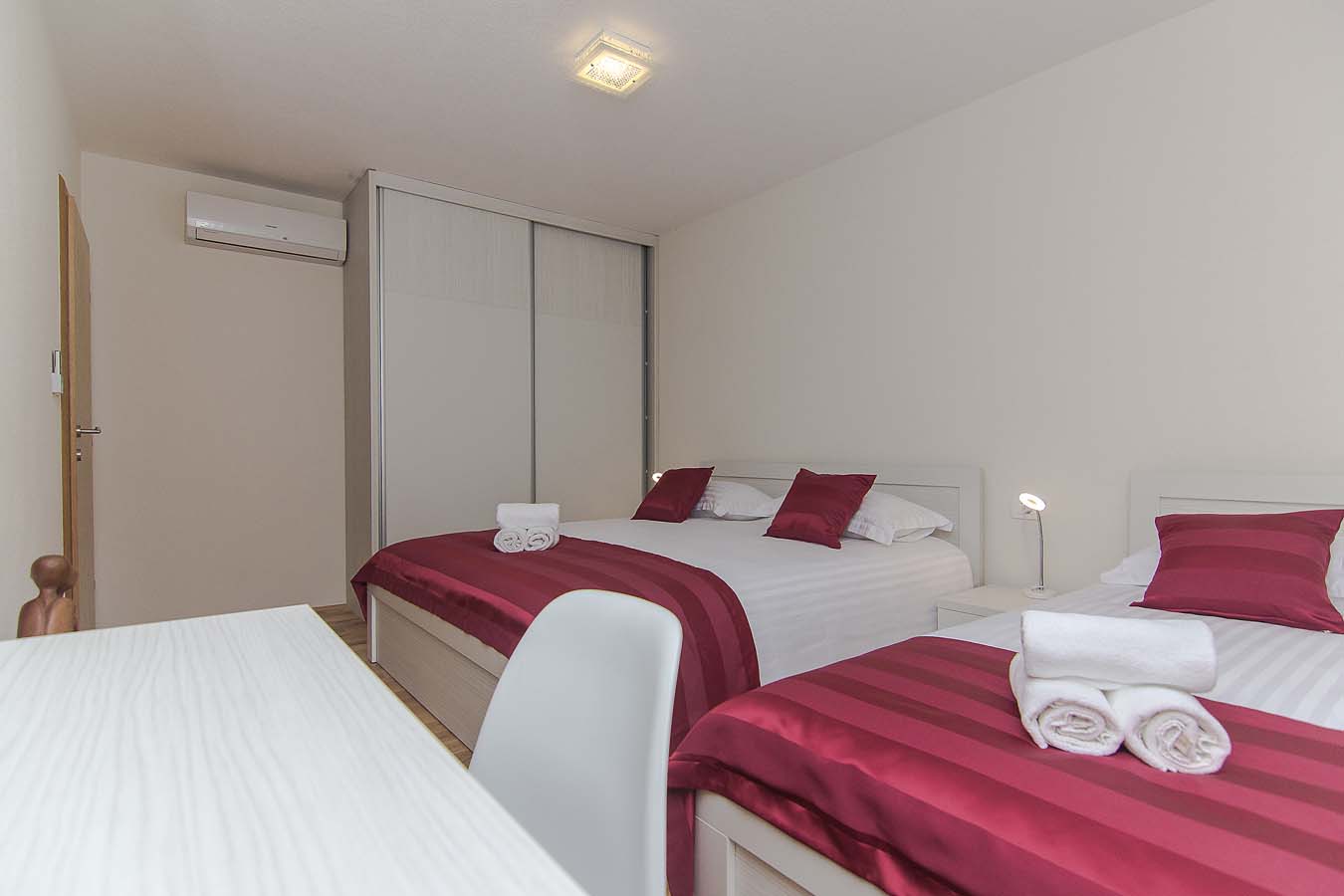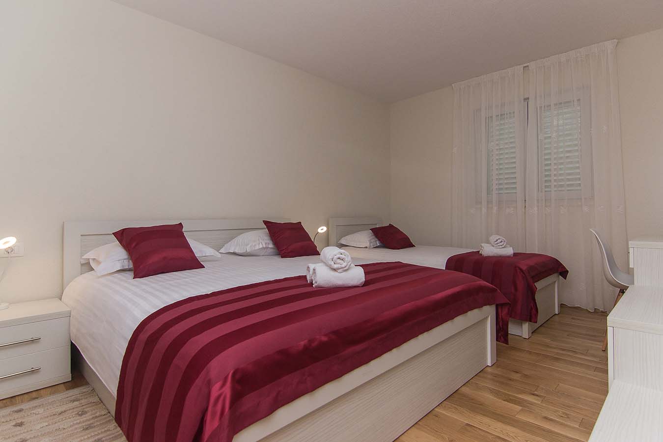 Luksuzno opremljen apartman na drugom katu vile pruža smještaj za do 10 osoba. Apartman se sastoji od četiri spavaće sobe, od kojih je prva s jednim bračnim i jednim krevetom za jednu osobu. Druga spavaća soba je namještena sa dva odvojena kreveta. Treća i četvrta su namještene sa dvostrukim krevetima. U dnevnom boravku nalazi se kauč na koji se može smjestiti dvije osobe. Kuhinja je opremljena sa pećnicom, perilicom posuđa, hladnjakom sa zamrzivačem, mikrovalnom pećnicom i svim potrebnim posuđem. Nadalje, uz kuhinju se nalazi blagovaonica sa velikim stolom za 10 osoba i balkonom. Stan je opremljen klima uređajem, SAT TV-om i WiFi internetom, a sve sobe imaju klimu. U blizini bazena je i zajednički roštilj. Privatni parking za do 10 automobila nalazi se u garaži u prizemlju kuće i povezan je dizalom sa ostatkom ville.