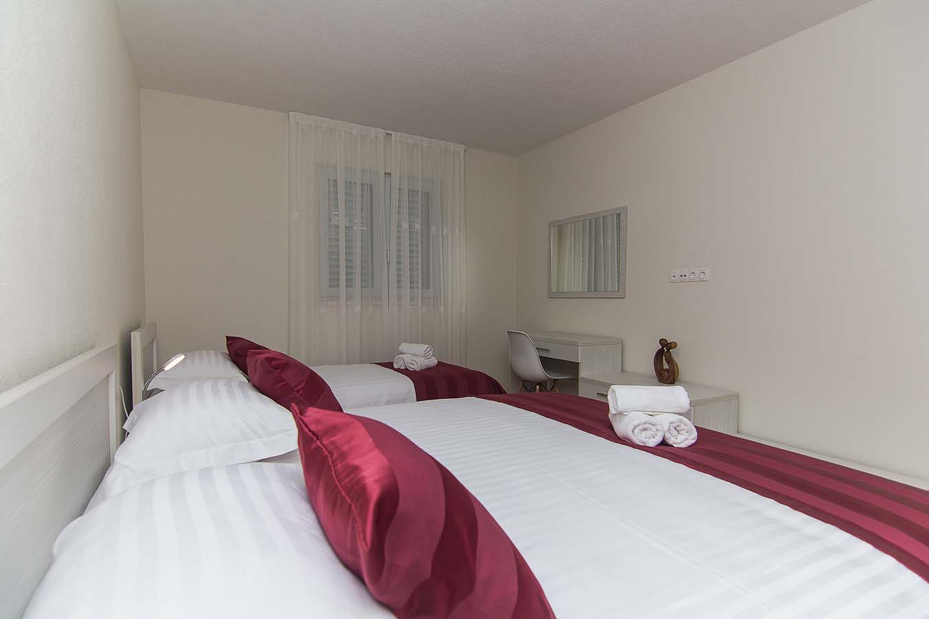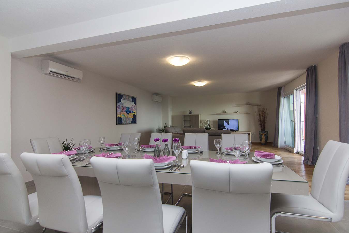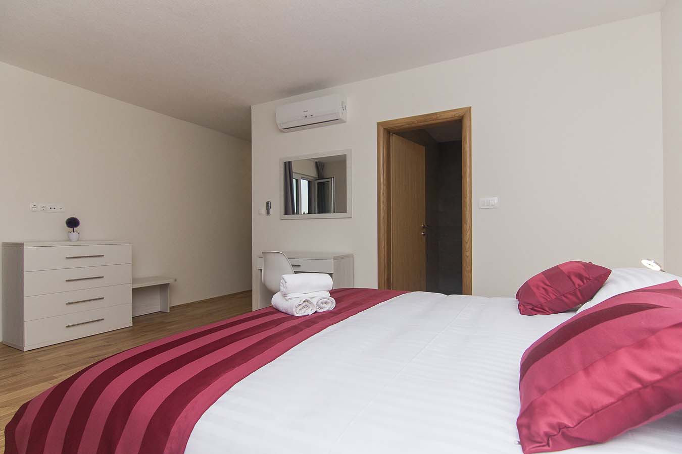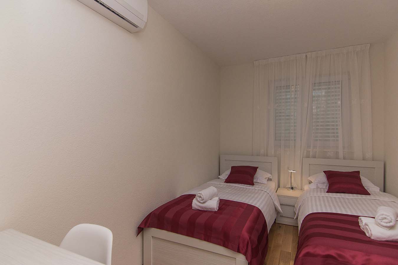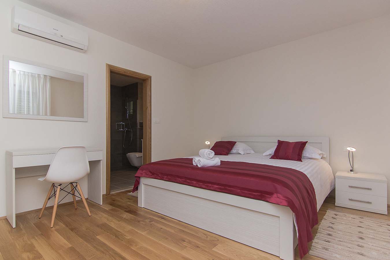 Luksuzno opremljen apartman na drugom katu vile pruža smještaj za do 10 osoba. Apartman se sastoji od četiri spavaće sobe, od kojih je prva s jednim bračnim i jednim krevetom za jednu osobu. Druga spavaća soba je namještena sa dva odvojena kreveta. Treća i četvrta su namještene sa dvostrukim krevetima. U dnevnom boravku nalazi se kauč na koji se može smjestiti dvije osobe. Kuhinja je opremljena sa pećnicom, perilicom posuđa, hladnjakom sa zamrzivačem, mikrovalnom pećnicom i svim potrebnim posuđem. Nadalje, uz kuhinju se nalazi blagovaonica sa velikim stolom za 10 osoba i balkonom. Stan je opremljen klima uređajem, SAT TV-om i WiFi internetom, a sve sobe imaju klimu. U blizini bazena je i zajednički roštilj. Privatni parking za do 10 automobila nalazi se u garaži u prizemlju kuće i povezan je dizalom sa ostatkom ville.