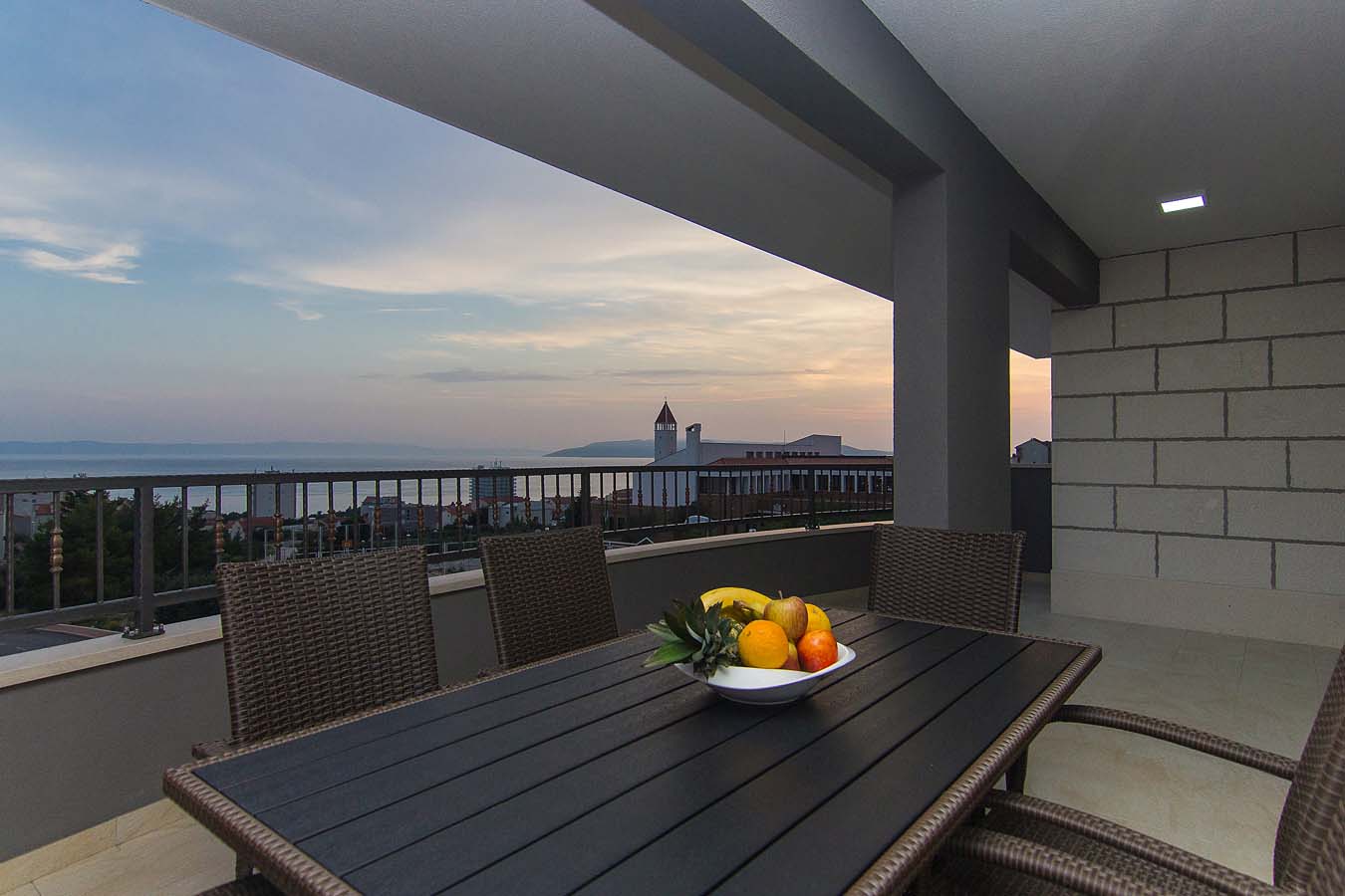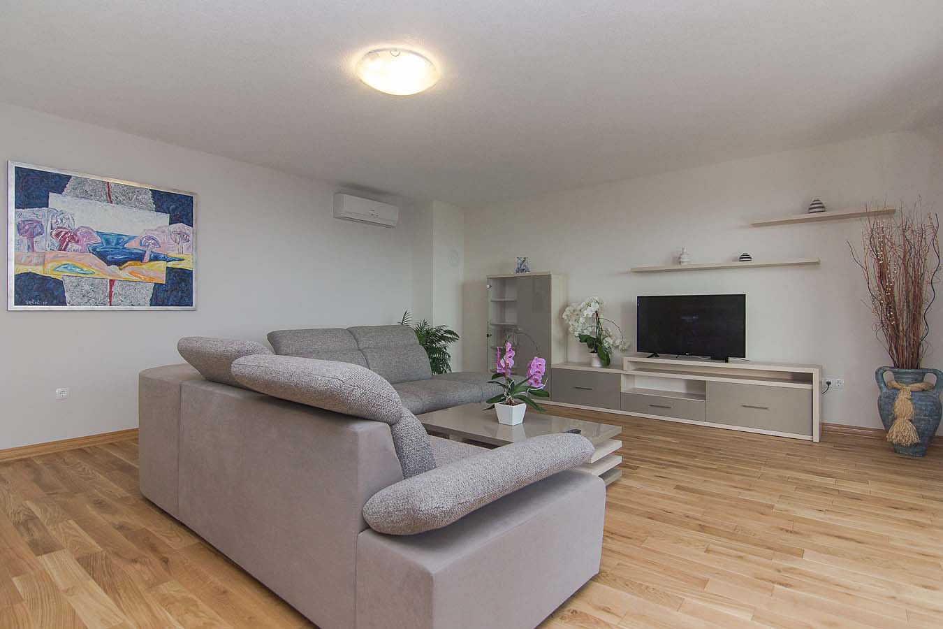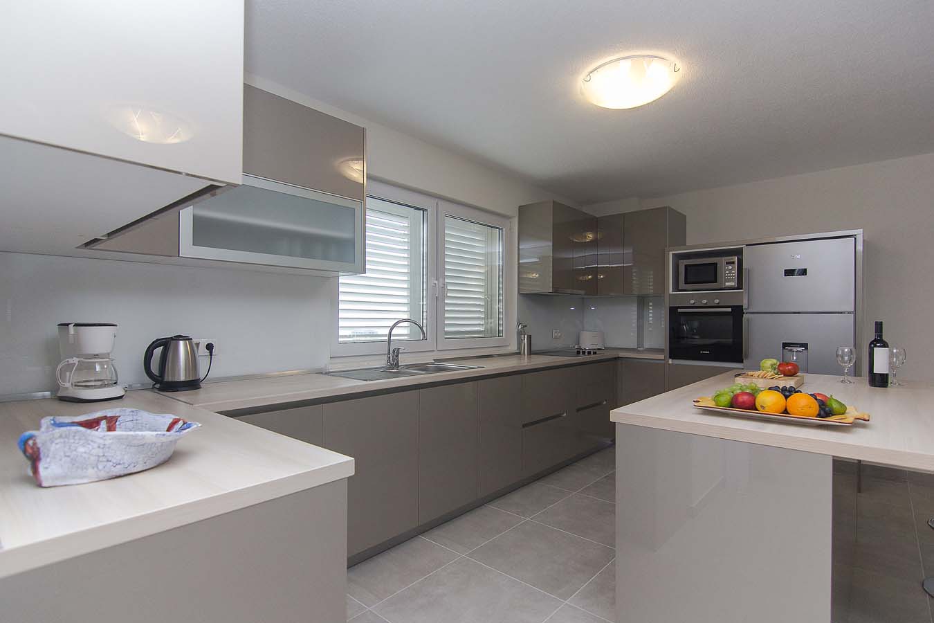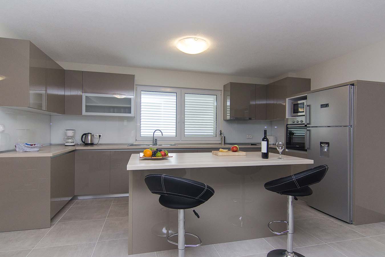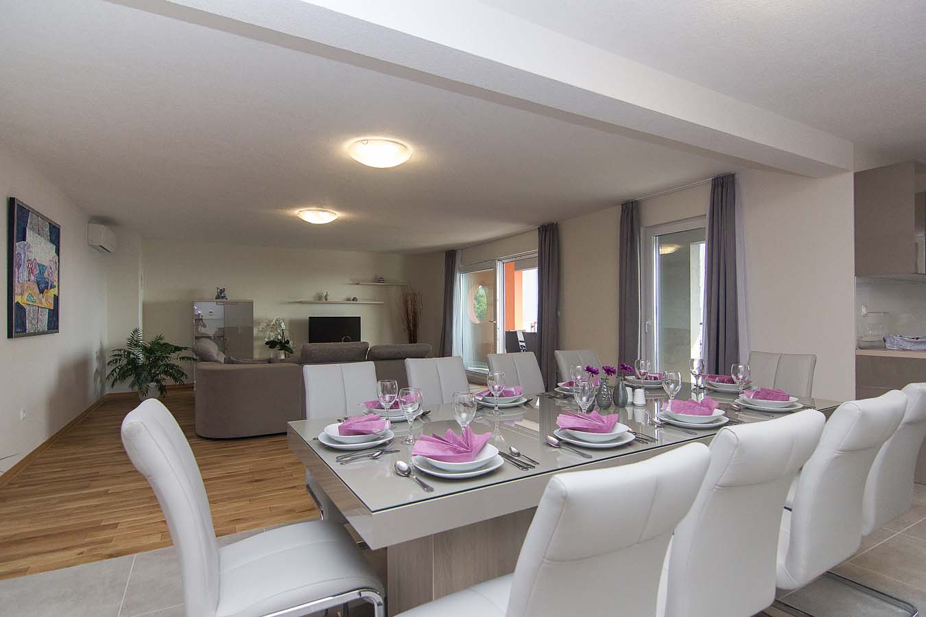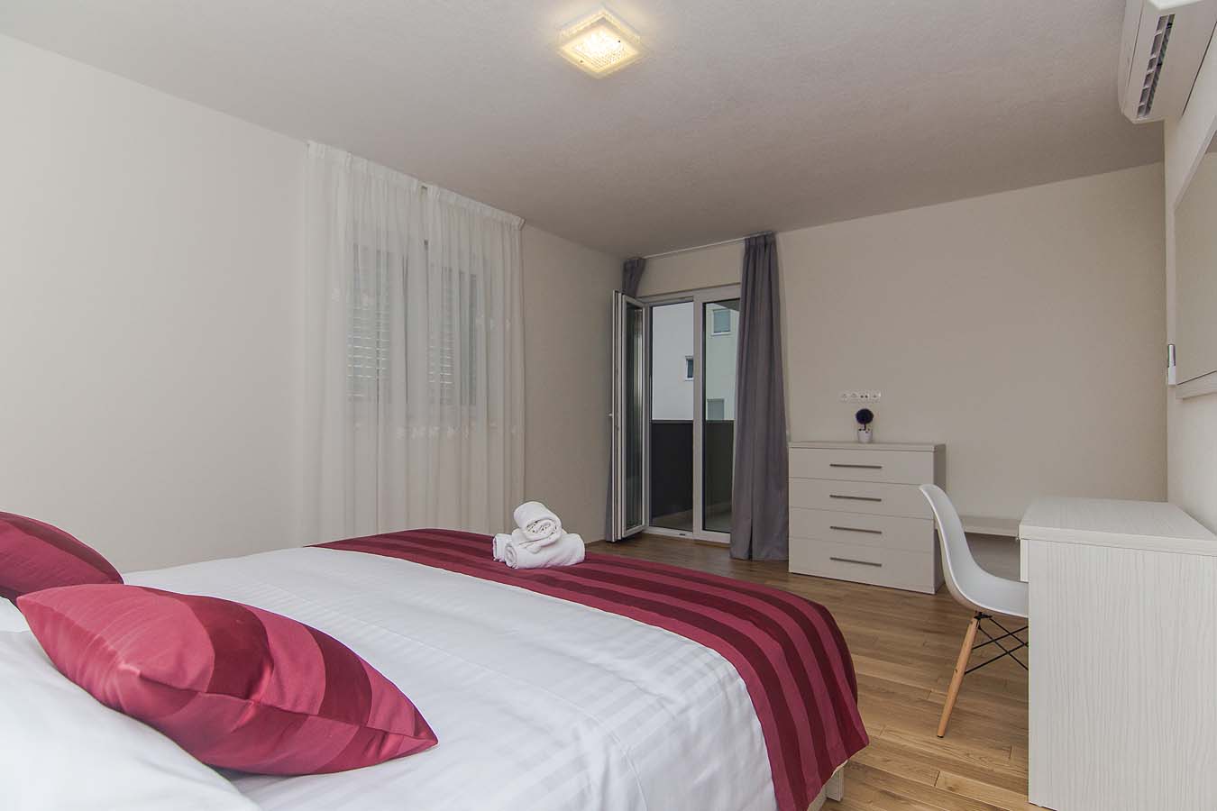 Luksuzno opremljen apartman na drugom katu vile pruža smještaj za do 10 osoba. Apartman se sastoji od četiri spavaće sobe, od kojih je prva s jednim bračnim i jednim krevetom za jednu osobu. Druga spavaća soba je namještena sa dva odvojena kreveta. Treća i četvrta su namještene sa dvostrukim krevetima. U dnevnom boravku nalazi se kauč na koji se može smjestiti dvije osobe. Kuhinja je opremljena sa pećnicom, perilicom posuđa, hladnjakom sa zamrzivačem, mikrovalnom pećnicom i svim potrebnim posuđem. Nadalje, uz kuhinju se nalazi blagovaonica sa velikim stolom za 10 osoba i balkonom. Stan je opremljen klima uređajem, SAT TV-om i WiFi internetom, a sve sobe imaju klimu. U blizini bazena je i zajednički roštilj. Privatni parking za do 10 automobila nalazi se u garaži u prizemlju kuće i povezan je dizalom sa ostatkom ville.