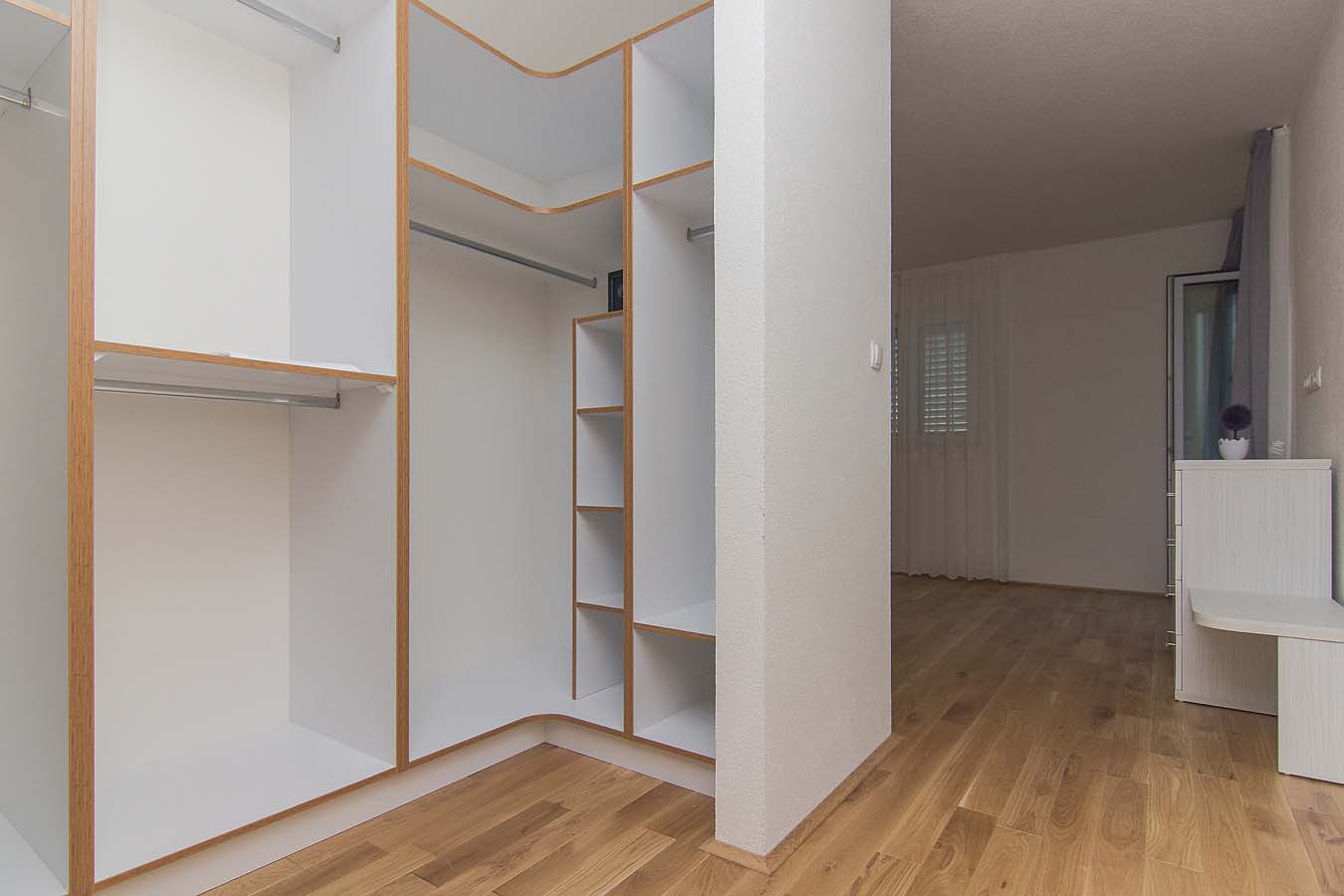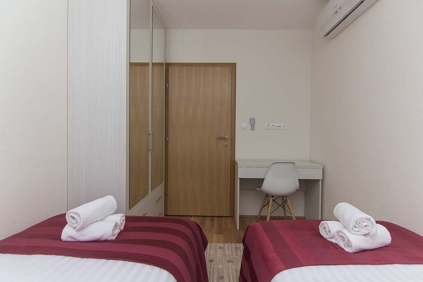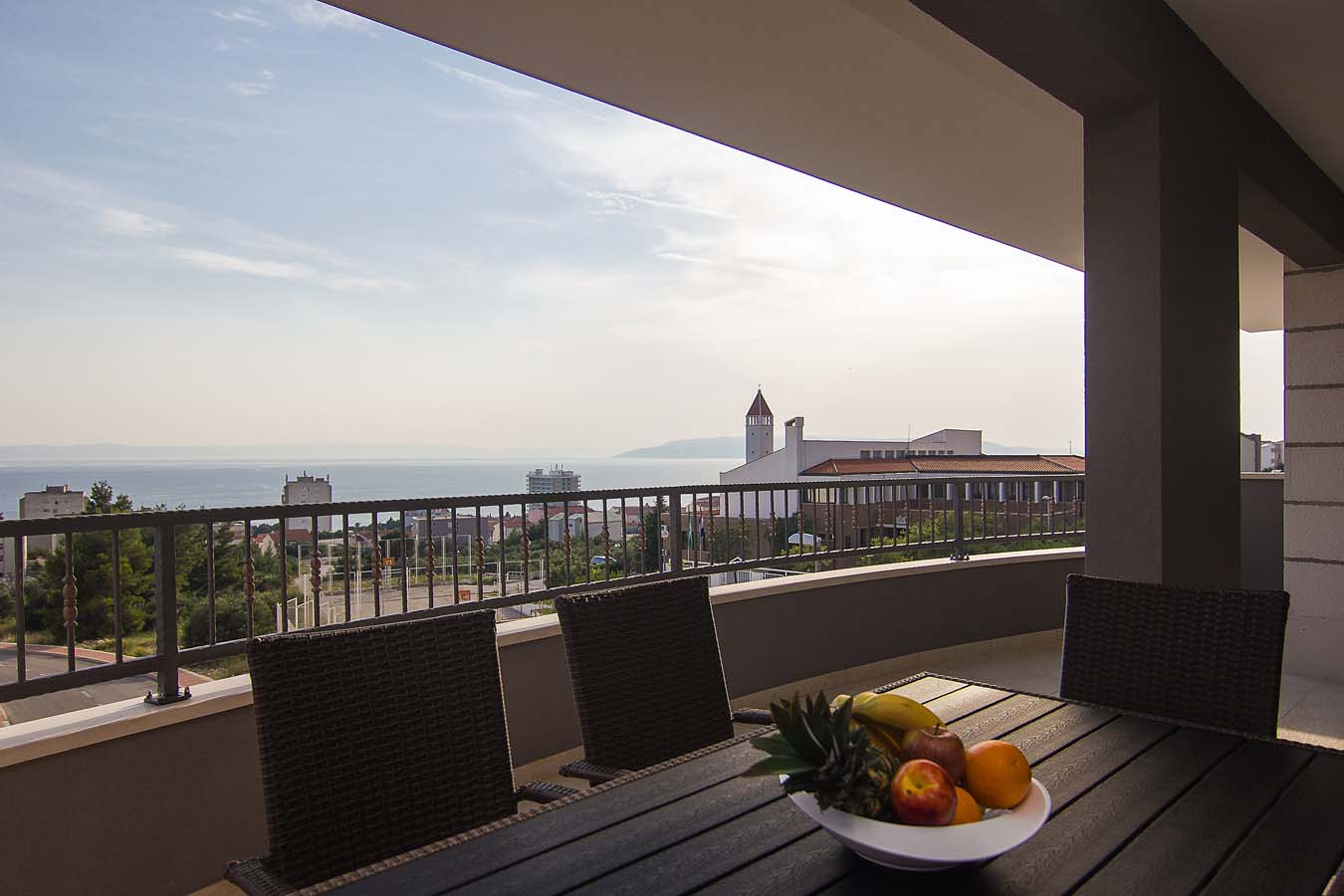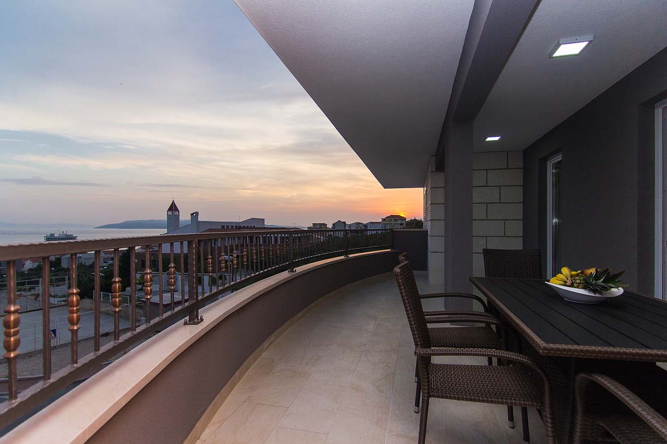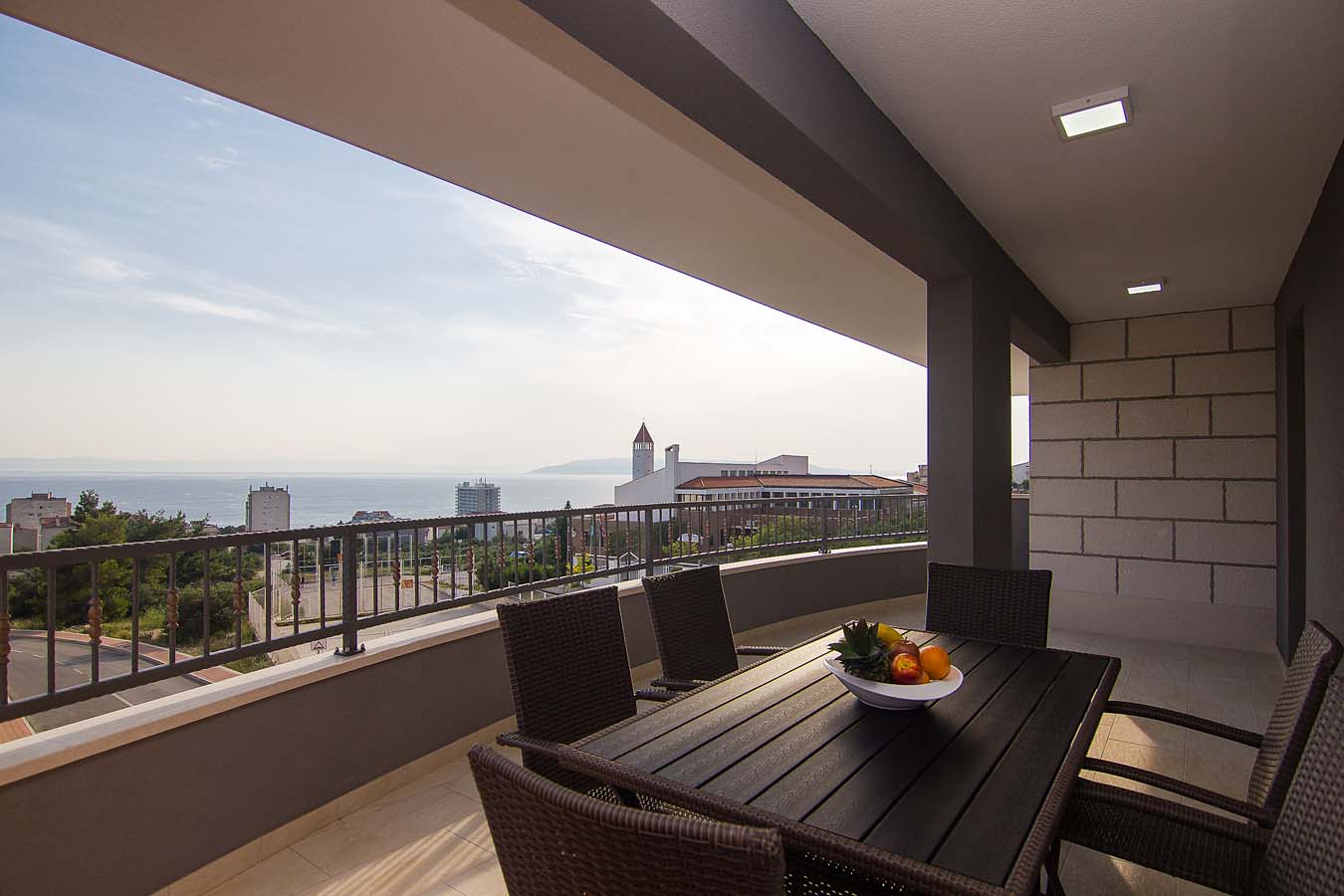 Luksuzno opremljen apartman na drugom katu vile pruža smještaj za do 10 osoba. Apartman se sastoji od četiri spavaće sobe, od kojih je prva s jednim bračnim i jednim krevetom za jednu osobu. Druga spavaća soba je namještena sa dva odvojena kreveta. Treća i četvrta su namještene sa dvostrukim krevetima. U dnevnom boravku nalazi se kauč na koji se može smjestiti dvije osobe. Kuhinja je opremljena sa pećnicom, perilicom posuđa, hladnjakom sa zamrzivačem, mikrovalnom pećnicom i svim potrebnim posuđem. Nadalje, uz kuhinju se nalazi blagovaonica sa velikim stolom za 10 osoba i balkonom. Stan je opremljen klima uređajem, SAT TV-om i WiFi internetom, a sve sobe imaju klimu. U blizini bazena je i zajednički roštilj. Privatni parking za do 10 automobila nalazi se u garaži u prizemlju kuće i povezan je dizalom sa ostatkom ville.
