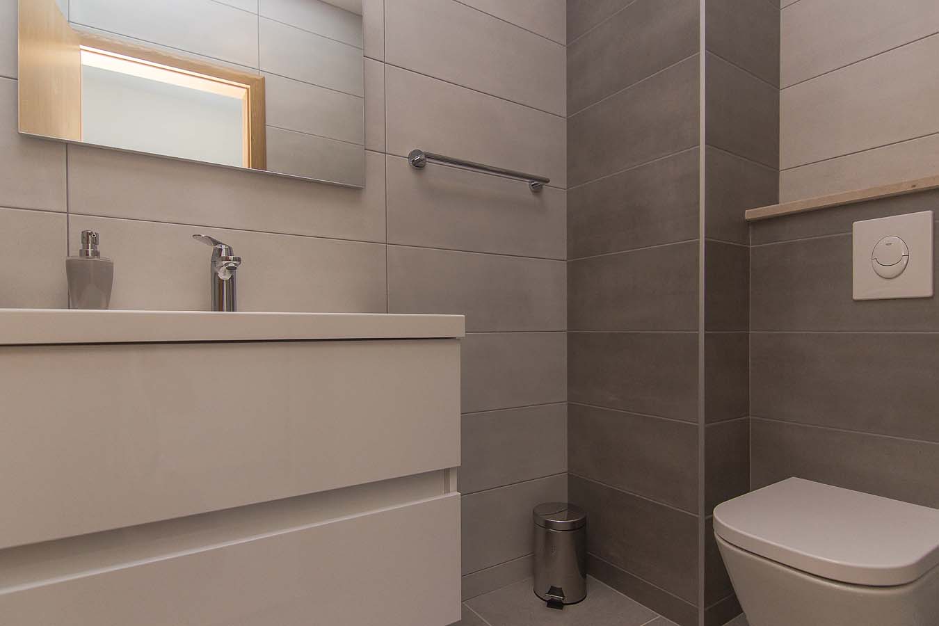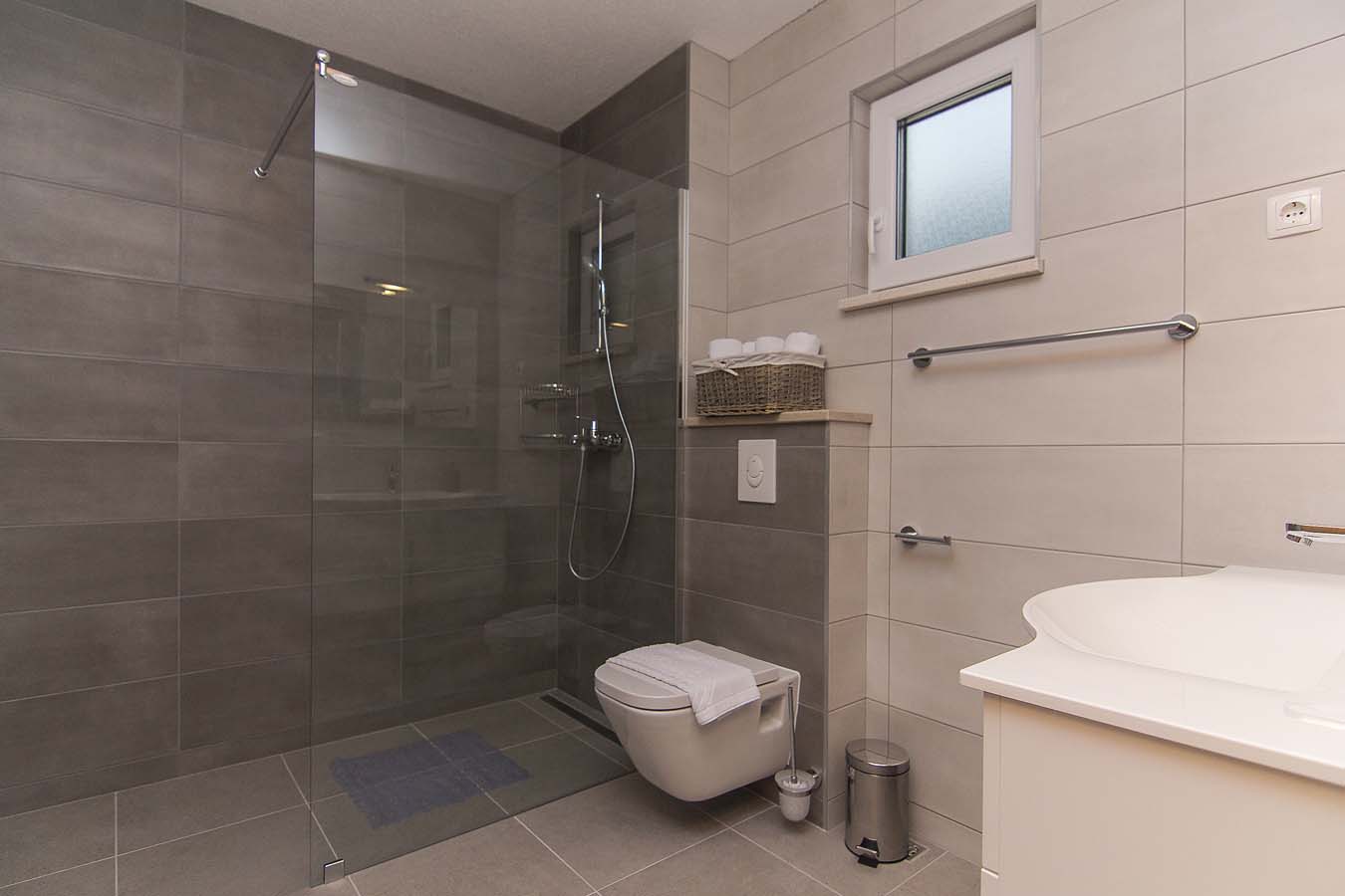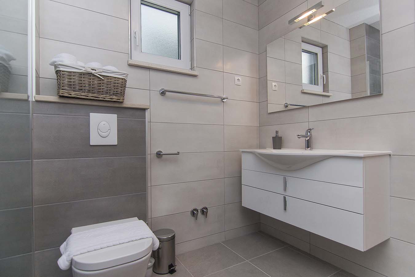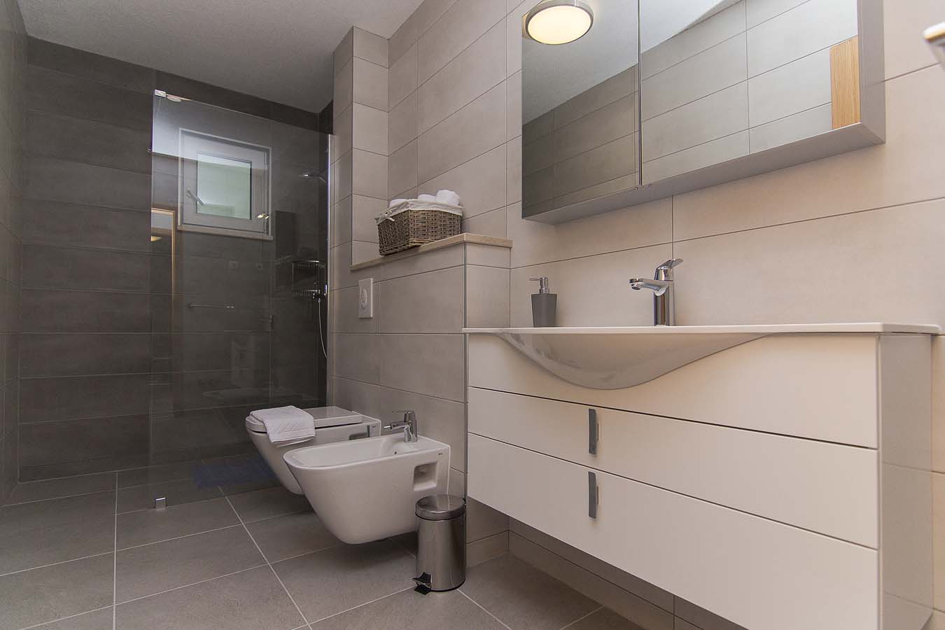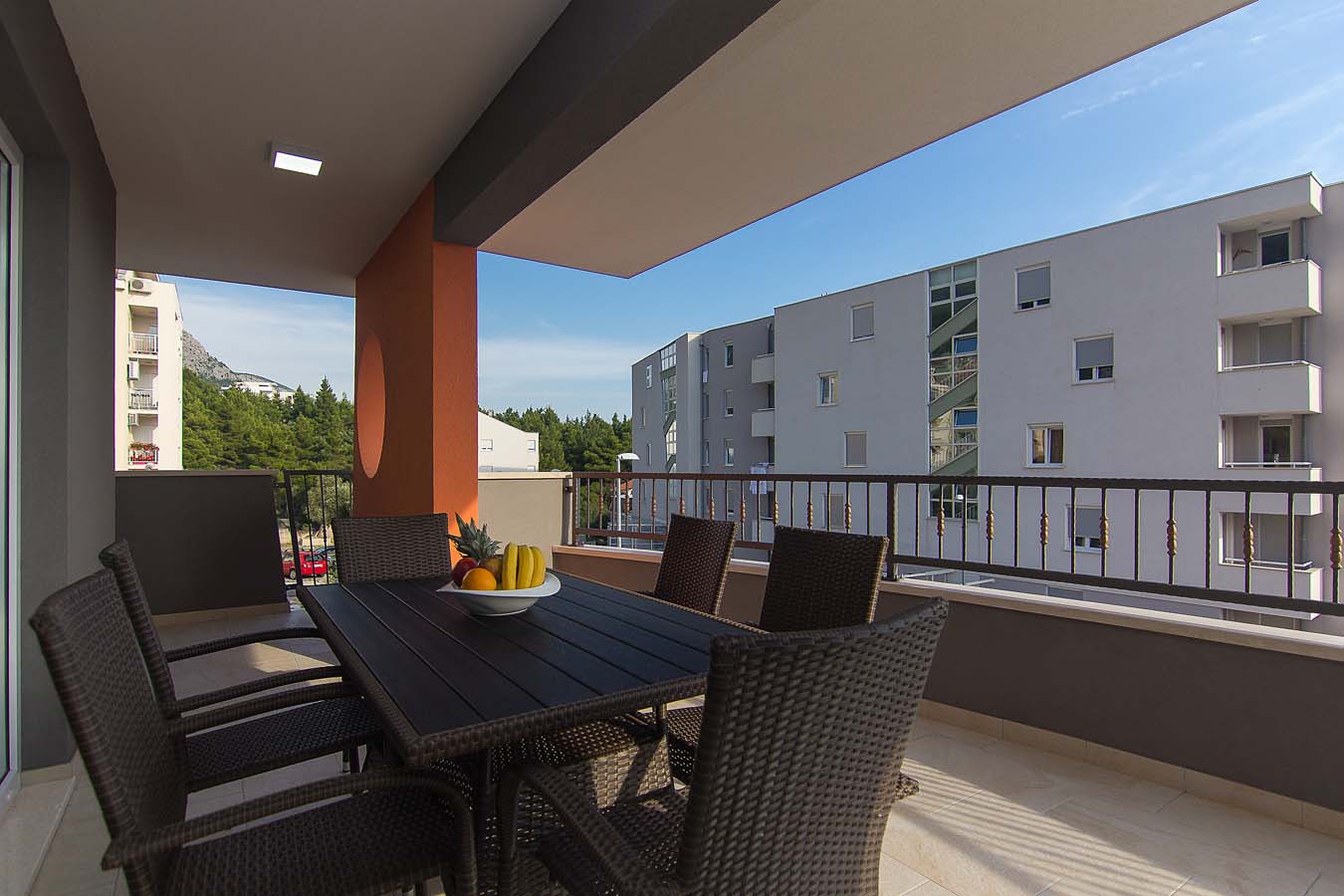Luksuzno opremljen apartman na drugom katu vile pruža smještaj za do 10 osoba. Apartman se sastoji od četiri spavaće sobe, od kojih je prva s jednim bračnim i jednim krevetom za jednu osobu. Druga spavaća soba je namještena sa dva odvojena kreveta. Treća i četvrta su namještene sa dvostrukim krevetima. U dnevnom boravku nalazi se kauč na koji se može smjestiti dvije osobe. Kuhinja je opremljena sa pećnicom, perilicom posuđa, hladnjakom sa zamrzivačem, mikrovalnom pećnicom i svim potrebnim posuđem. Nadalje, uz kuhinju se nalazi blagovaonica sa velikim stolom za 10 osoba i balkonom. Stan je opremljen klima uređajem, SAT TV-om i WiFi internetom, a sve sobe imaju klimu. U blizini bazena je i zajednički roštilj. Privatni parking za do 10 automobila nalazi se u garaži u prizemlju kuće i povezan je dizalom sa ostatkom ville.